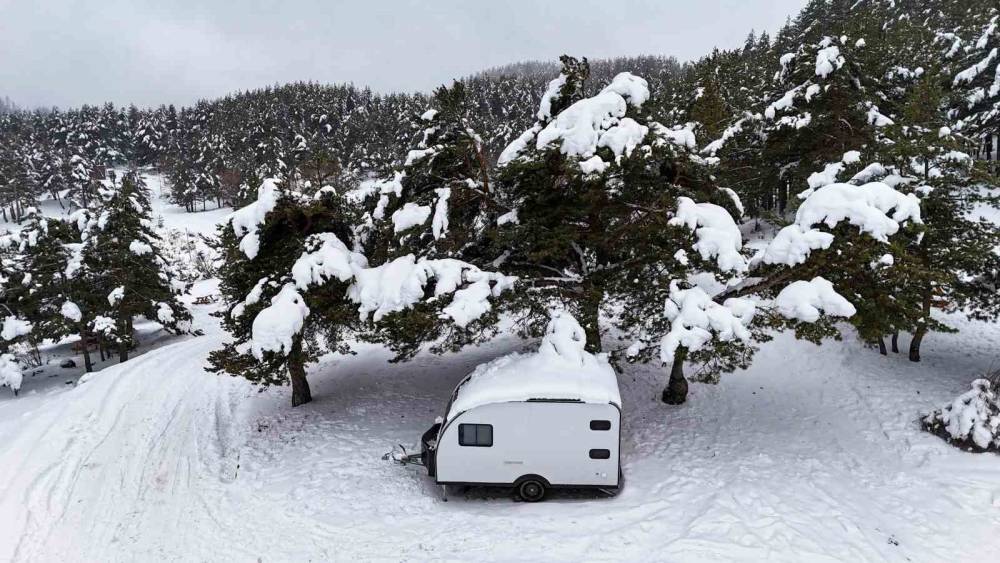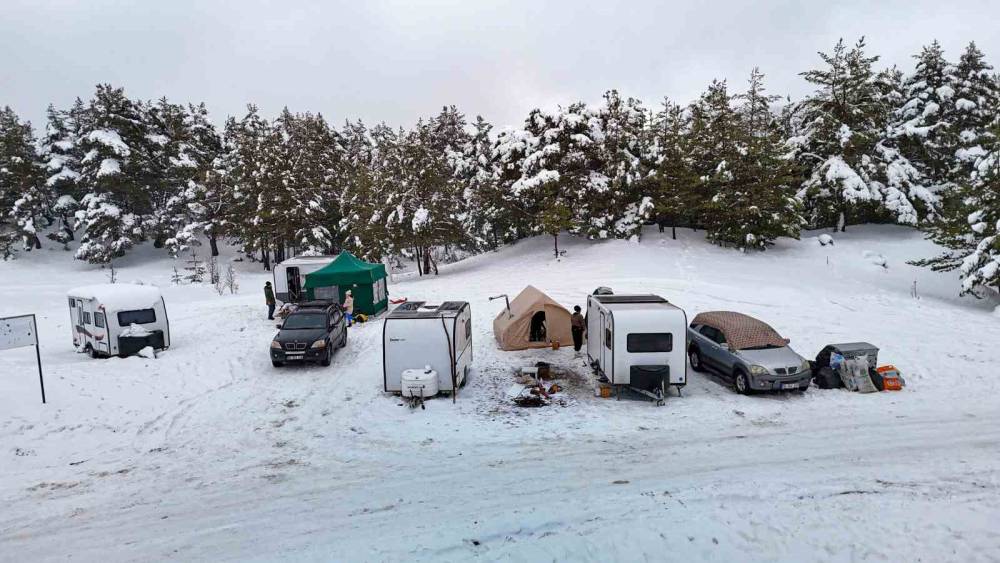 Ankara’nın Kızılcahamam ilçesinde bulunan Işık Dağı eteklerindeki Karagöl Jeositi, kar yağışıyla beyaza bürünürken, kış tatilini doğayla iç içe geçirmek isteyen Başkentlilerin yeni adresi Uludağ yerine Işık Dağı oldu.Ankara’nın Kızılcahamam ilçesinde merkeze 35 kilometre uzaklıktaki Işık Dağı’nın eteğinde bulunan yaylalar ve Karagöl Jeositi, temiz havası ve doğal güzellikleri dolayısıyla günübirlik ziyaret ve çadır kampı için doğaseverlere harika bir fırsat sunuyor. Kar yağışlarının ardından Türkiye’nin dört bir yanından gelen ve doğanın tadını çıkarmak isteyen vatandaşlar, okulların tatil olmasını fırsat bilerek kış tatili için Uludağ yerine Işık Dağı’nın yolunu tuttu. Tabiatla iç içe vakit geçirmek isteyen kamp tutkunlarının kimi gölün etrafında karavan ile konaklarken kimi ise çadır kurdu. Ayrıca dron ile görüntülenen, etrafı beyaza bürünmüş dağlar ve çeşitli ağaçlarla çevrili olan Karagöl’de kış mevsimiyle eşsiz seyirlik manzaralar oluştu."Uludağ yerine Işık Dağı’nı görmeleri lazım"Şehrin stresinden uzaklaşmak için Işık Dağı’na geldiklerini ve atmosferin güzel olduğunu söyleyen Serkan Çetin, "Malum okullar da tatil, bu sebepten dolayı bir kaçalım dedik. Ben de Kızılcahamamlıyım. Ben buraya yaz aylarında da geliyorum. Yaz aylarında çevreyi çok kirli bırakıyorlar. Her taraf çöp oluyor. İnsanların biraz daha duyarlı olması lazım. Çevremizi temiz tutmamız lazım. Ben yeri geliyor burada çöp topluyorum ve konteynerlere atıyorum. Bu kar örtüsünde görünmüyor ama yazın bu durum çok oluyor. Işık Dağı Ankara’ya çok yakın, çok güzel bir yer. Kesinlikle gelip görmeleri lazım. Uludağ yerine Işık Dağı’nı görmeleri lazım. Anlatmayla olmaz, gelip görecekler, mükemmel bir yer" ifadelerini kullandı.