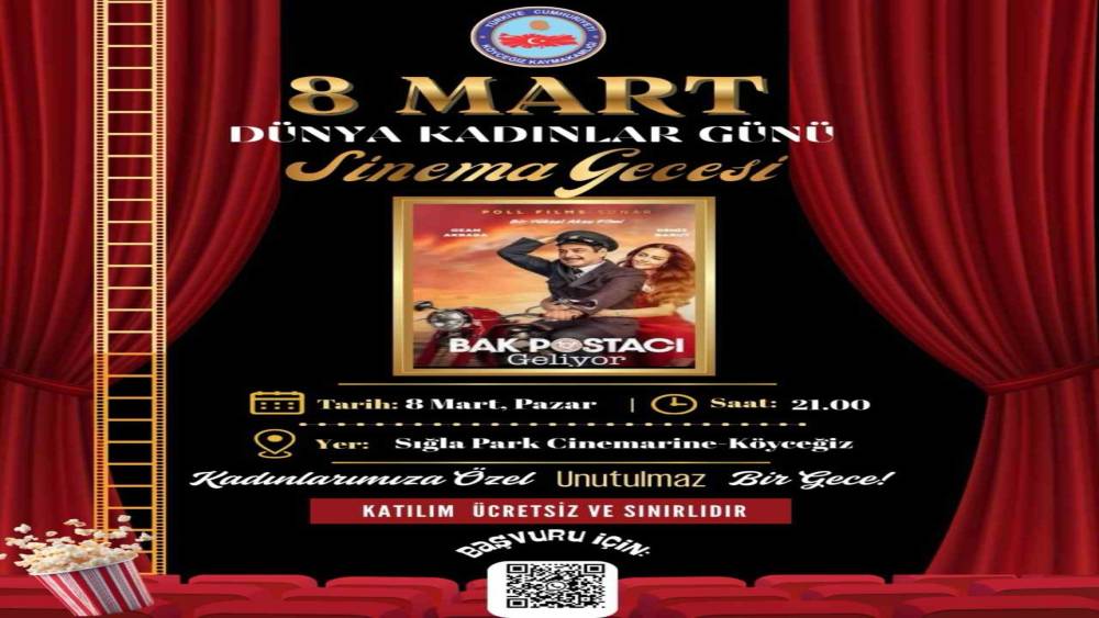 Muğla’nın Köyceğiz ilçesinde Kaymakamlık tarafından 8 Mart Dünya Kadınlar Günü’ne özel sinema gecesi düzenlenecek.Köyceğiz Kaymakamlığı tarafından, 8 Mart Dünya Kadınlar Günü kapsamında kadınlara özel sinema gecesinde ‘Bak Postacı Geliyor’ filminin gösterimi gerçekleştirilecek. ‘Bak Postacı Geliyor’ filmi 8 Mart Pazar günü, Saat 21.00’da bir işletmeye ait sinema salonunda kadınlara özel gösterime sunulacak. Köyceğiz Kaymakamlığından yapılan açıklamada, "Kadınlarımızın bu özel gününü birlikte, keyifli bir sinema akşamı ile taçlandırmak istiyoruz. Katılım ücretsiz ve sınırlıdır. Tüm kadınlarımız davetlidir" ifadelerine yer verildi.