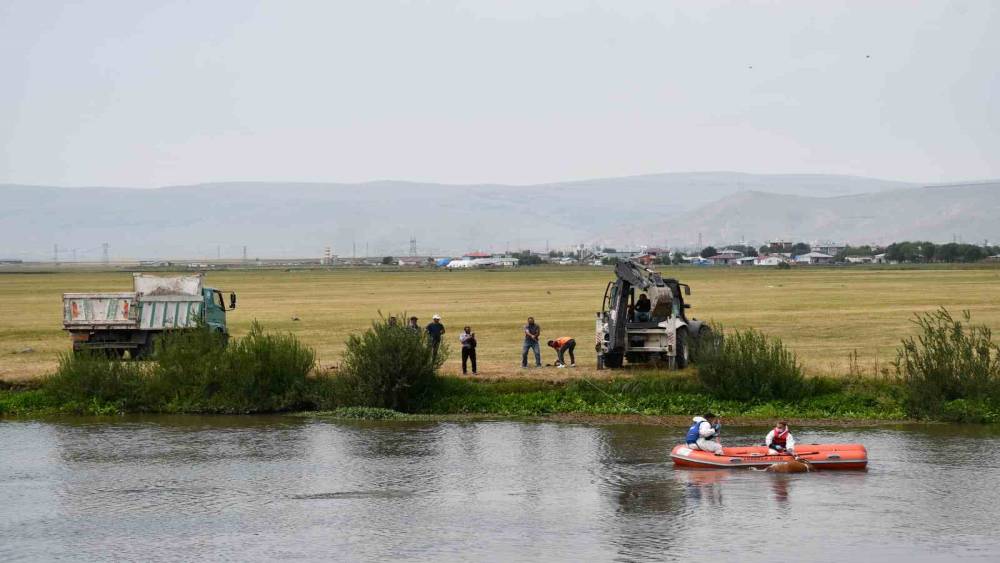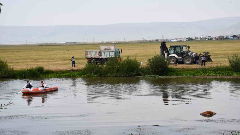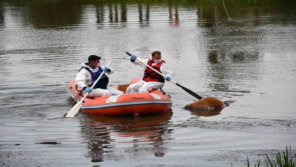 AFAD arama ve kurtarma ekibi, bot yardımıyla boğularak ölen hayvanı sudan çıkarmak için çalışma başlattı.