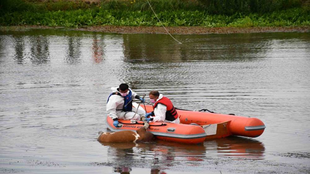 Ardahan’da Kura nehri kıyısında dolaşan vatandaşlar, nehirde yüzen ineğin cansız bedeni ile karşılaştı.Ardahan ovasındaki merada otlandığı sırada Kura nehrine düşen inek suyun akıntısı ile birlikte sürüklenmeye başladı. Vatandaşların fark ettiği inek bir müddet sürüklendikten sonra suda boğularak telef oldu. Vatandaşların ihbarı üzerine bölgeye AFAD ve Belediye ekipleri yönlendirildi.AFAD arama ve kurtarma ekibi, bot yardımıyla boğularak ölen hayvanı sudan çıkarmak için çalışma başlattı.Telef olan büyükbaş hayvanı, yaklaşık 1 saatlik çalışma sonucunda bulunduğu yerden kepçe yardımıyla çıkartıldı.