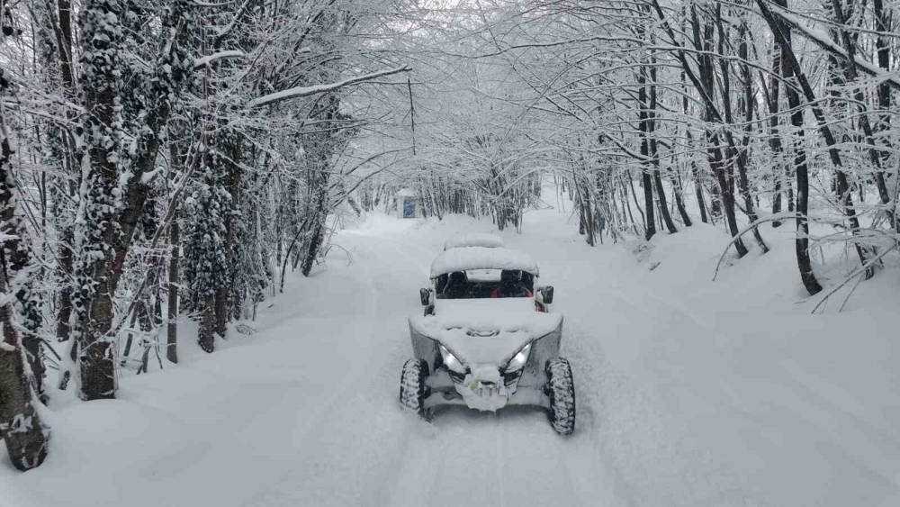 Kocaeli genelinde etkili olan kar yağışı, özellikle yüksek kesimlerde muazzam görüntüler oluşturdu. Doğanın sunduğu bu görsel şöleni fırsat bilen adrenalin tutkunları, UTV araçlarıyla zorlu parkurlara meydan okudu. Lapa lapa yağan karın altında, beyaz örtüyle kaplanan orman yollarında ilerleyen vatandaşlar, hem karın tadını çıkardı hem de doyasıya eğlendi. Şehrin gürültüsünden uzak, tamamen doğayla iç içe gerçekleşen bu yolculukta, UTV araçlarının performansı ve karın sunduğu zorlu şartlar heyecanı ikiye katladı.
