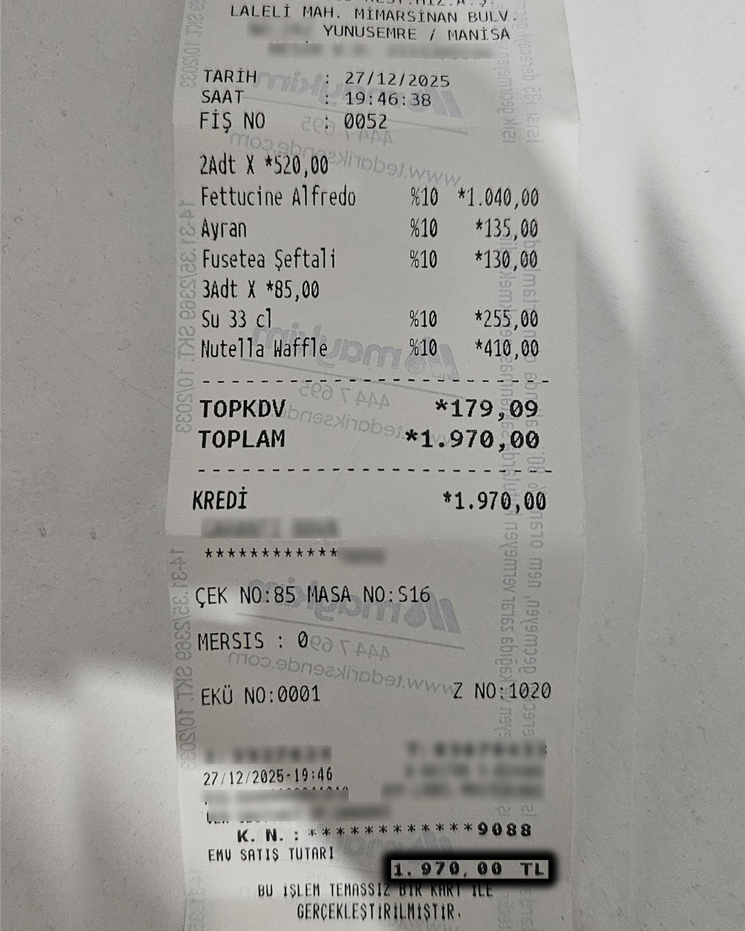 Manisa’daki bir işletmeye giderek 2 tabak Alfredo makarna, 1 Ayran, 1 Fusetea Şeftali, 3 Su ve 1 Waffle siparişi veren bir vatandaş toplamda 1.970 TL hesap ödedi.