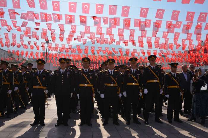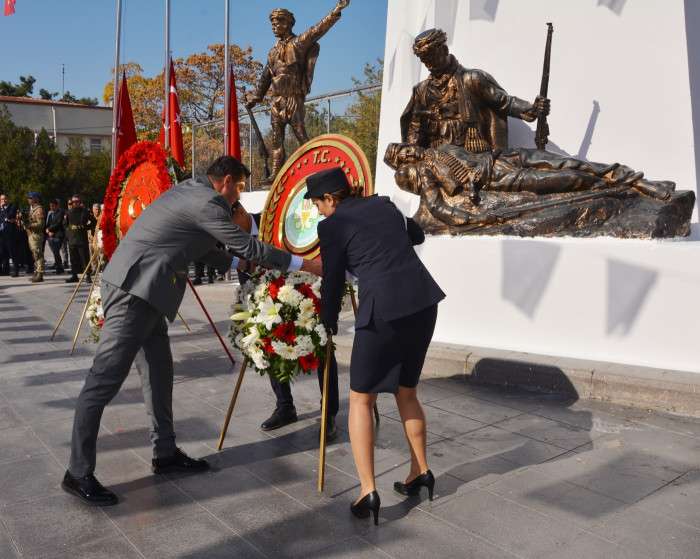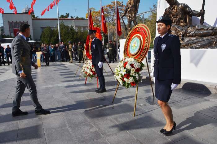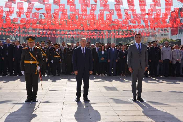 Çelenk sunumunun ardından 1 dakikalık saygı duruşunda bulunuldu ve İstiklal Marşı okundu. Törende ayrıca Hasan Türek Anadolu Lisesi’nin 101 öğrencisi cumhuriyetin 101. yılına özel halk oyunları gösterisi gerçekleştirdi. (İHA)