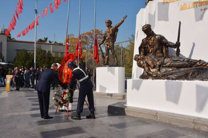 Manisa Valisi Vahdettin Özkan, Garnizon Komutanı 1'inci Komando Eğitim Tugay Komutanı Piyade Albay Cengiz Güven ve Manisa Büyükşehir Belediye Başkanı Ferdi Zeyrek tarafından anıta çelenk sunuldu.