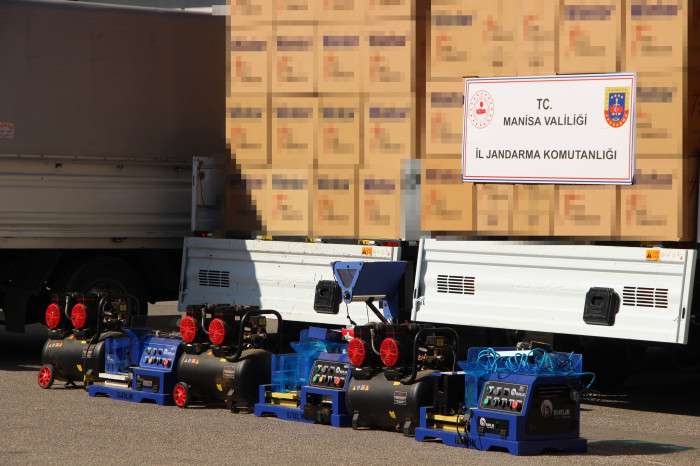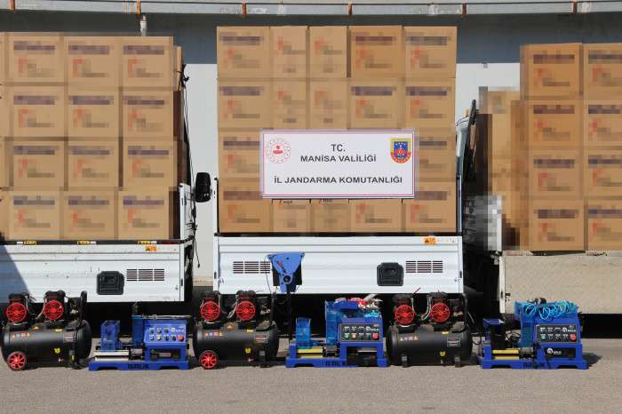 Manisa İl Jandarma Komutanlığı KOM ekiplerince yapılan istihbarı çalışmalar neticesinde, KOM ve Şehzadeler İlçe Jandarma Komutanlığı ekiplerince polis bölgesi olan Şehzadeler ilçesi Ege Mahallesi’ndeki M.Ç. (43/E) ve K.Ç. (37/E) isimli şahıslara ait 2 işyeri ve 3 depoda sabah 07.00’de eş zamanlı olarak yapılan aramalarda, piyasa değeri 12 milyon 500 bin TL olan, 21 milyon 101 bin 800 adet boş makaron, 52 bin 800 adet tütün doldurulmuş makaron, 2 bin 500 kilogram kaçak tütün, bin750 kilogram nargile tütün, 300 bin adet sigara sarma kağıdı, 176 paket kaçak sigara, 135 adet elektronik sigara likiti, 900 adet sahte bandrol, 110 adet elektrikli sigara sarma makinesi, 3 adet ticari sigara sarma makinesi, 3 adet ticari sigara sarma makinelerine ait kompresör, 1.750 adet kaçak puro ele geçirildi. Ele geçirilen ürünler 10 kamyona yüklenerek Manisa İl Jandarma Komutanlığında muhafaza altına alındı. Şüpheliler M.Ç. (43/E) ve K.Ç. (37/E) hakkında Cumhuriyet Savcısının talimatı ile adli tahkikata başlandığı açıklandı. (İHA)
