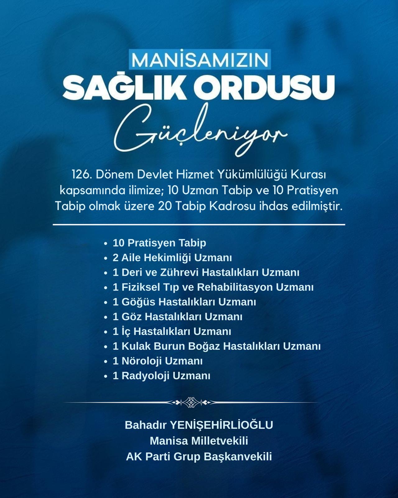 Sosyal medya hesabından açıklama yapan AK Parti Grup Başkanvekili ve Manisa Milletvekili Bahadır Yenişehirlioğlu, Sağlık Bakanlığı tarafından gerçekleştirilen 126. Dönem Devlet Hizmet Yükümlülüğü Kurası kapsamında Manisa’ya 10 Uzman Tabip ve 10 Pratisyen Tabip olmak üzere toplam 20 yeni hekim kadrosu tahsis edildiğini ifade etti.