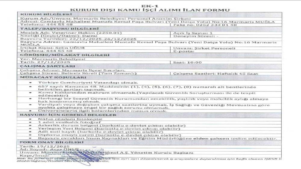 Söz konusu ilan, Marmaris Belediyesi Personel AŞ tarafından kurum dışı kamu işçi alımı kapsamında yayımlanmış, 1 veteriner hekim alımı yapılacağı, pozisyonun daimi ve tam zamanlı olduğu ilan metninde açıkça belirtilmişti. Başvuruların Marmaris’te şahsen alınacağı ve görüşmenin 27 Aralık’ta yapılacağı bilgisi de İŞKUR sisteminde yer almıştı.