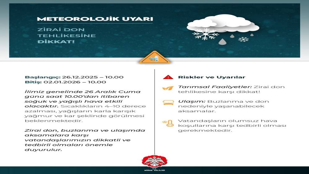Niğde Valiliği, Meteoroloji Genel Müdürlüğü 8. Bölge Müdürlüğü’nün son değerlendirmelerine dayanarak il genelini kapsayan meteorolojik uyarıda bulundu.Yapılan açıklamaya göre; 26 Aralık 2025 Cuma günü saat 10.00’dan itibaren Balkanlar üzerinden gelecek soğuk ve yağışlı havanın Niğde’de etkili olması bekleniyor. Uyarının 2 Ocak 2026 Perşembe günü saat 10.00’a kadar devam edeceği bildirildi. Açıklamada; hava sıcaklıklarının mevsim normallerine göre 4 ila 10 derece arasında hissedilir şekilde azalacağı, soğuk havanın önümüzdeki hafta boyunca etkisini sürdüreceği ifade edildi. Bu süreçte yağışların karla karışık yağmur ve kar şeklinde görüleceği, en düşük hava sıcaklıklarının ise eksi 9 dereceye kadar düşebileceğinin öngörüldüğü belirtildi.Valilik tarafından yapılan uyarıda; özellikle tarımsal faaliyetlerle uğraşan üreticiler başta olmak üzere tüm vatandaşların zirai don riski, buzlanma ve don olayları ile ulaşımda yaşanabilecek aksamalar konusunda dikkatli ve tedbirli olmaları istendi.