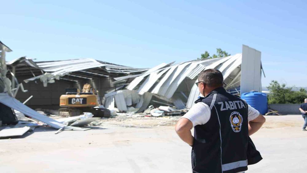 Bursa’nın Nilüfer ilçesi Yaylacık Mahallesi’nde tarım arazisi üzerine inşa edilen 1 depo belediye ekipleri tarafından yerle bir edildi. Nilüfer Belediyesi ekipleri tarafından tespit edilerek, yasal prosedürleri tamamlanan ruhsatsız yapılar bir bir yıkılıyor. Çevik kuvvet ve zabıta ekiplerinin güvenlik önlemleri çerçevesinde, Yaylacık Mahallesi’nde bin 500 metrekarelik bir depo tamamen yıkılırken, 280 metrekarelik depo da kullanılamaz hale getirildi.