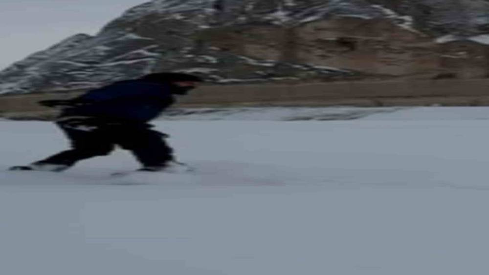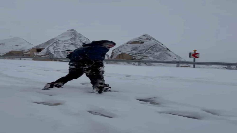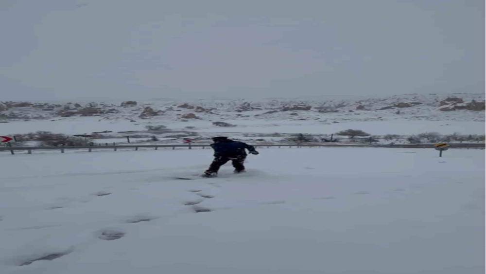 Kapadokya’da kar kartpostallık görüntüler sunarken bazı vatandaşlar, peri bacaları arasında snowboard yaparak karın tadını çıkardı.