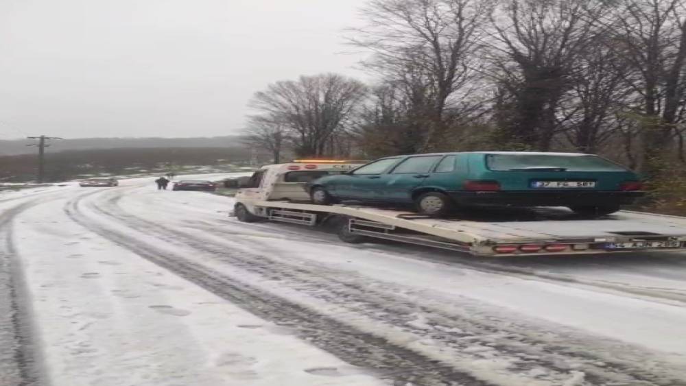 Karasu ilçe merkezinde etkili olan kar yağışı nedeniyle trafikte aksamalar yaşandı. Kar yağışına hazırlıksız yakalanan ve yolda kalan bazı sürücüler, araçlarını kurtarmak için çekici yardımı almak zorunda kaldı.