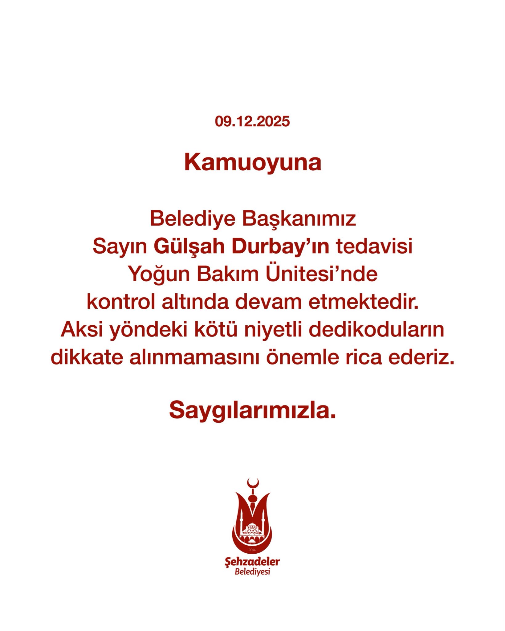 Yapılan açıklamada, "Belediye Başkanımız Sayın Gülşah Durbay’ın tedavisi Yoğun Bakım Ünitesi’nde kontrol altında devam etmektedir. Aksi yöndeki kötü niyetli dedikoduların dikkate alınmamasını önemle rica ederiz." denildi.