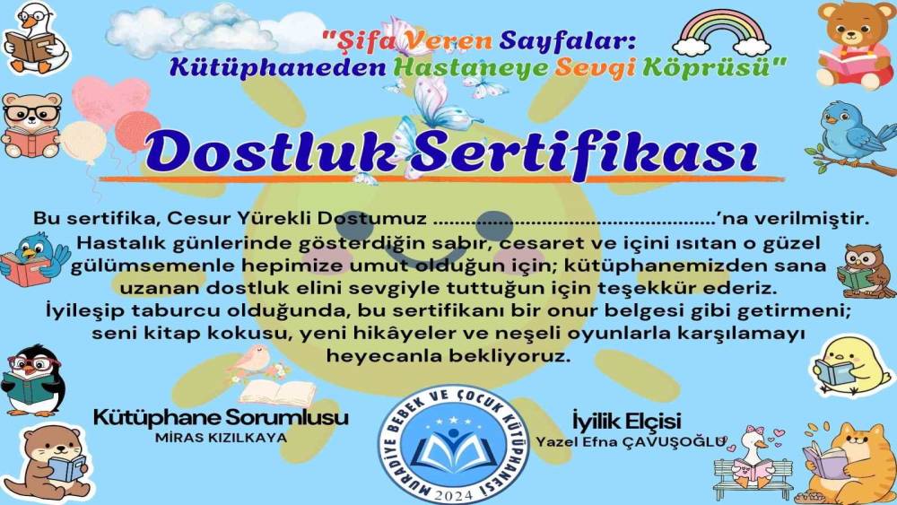 Van’ın Muradiye ilçesindeki Bebek ve Çocuk Kütüphanesi, kütüphanecilik anlayışını dört duvarın dışına taşıyan "Şifa Veren Sayfalar: Kütüphaneden Hastaneye Sevgi Köprüsü" projesini hayata geçirdi."Bir sayfa çevir, bir kalbe dokun" mottosuyla yola çıkan proje kapsamında; kütüphane üyesi gönüllü çocuklar, hastanede tedavi gören akranlarına hem kitap şifası hem de moral taşıyor. Türkiye’de bir ilk olma özelliği taşıyan bu çalışmada, kütüphanede kurulan ’İyileştiren Eller Atölyesi’nde bizzat çocuklar tarafından hazırlanan ’İyilik Heybeleri’ ve ’Dostluk Sertifikaları’ hastane odalarına ulaştırılacak. Kütüphaneci rehberliğinde ancak çocukların başrolde olacağı bu modelde; kitapların iyileştirici gücünü temel alan bibliyoterapi yöntemiyle ’İyilik Elçileri’ akranlarına kitap okuyarak hastane ortamını geçici bir kütüphaneye ve sosyal dayanışma merkezine dönüştürecek. Bu sayede okuma eylemi, sadece bir etkinlik olmaktan çıkıp çocukların tedavi sürecine psikolojik destek sağlayan bir şifa aracına dönüşecek.Projenin en dikkat çekici yanı ise oluşturacağı sürdürülebilir döngü ve kesintisiz takip süreci olacak. Belirli periyotlarla düzenli olarak tekrar edilecek olan bu çalışma, çocukların taburcu olmasıyla sona ermeyecek; aksine iyileşme süreçleri takip edilen çocuklar kütüphanede özel olarak ağırlanarak bu bağ kalıcı bir kültür dostluğuna dönüştürülecektir.Bir sayfa çevrildiğinde sadece bir hikaye başlamaz, bir kalbe dokunulur" anlayışı ve "İyileştiren Kütüphane" vizyonuyla hareket eden Muradiye Bebek ve Çocuk Kütüphanesi; bu projeyle merhametle donatılmış, empati duygusu yüksek bir nesil inşa etmeyi hedefliyor.