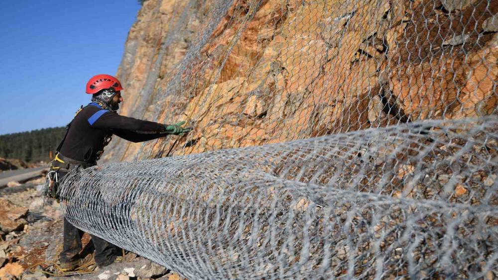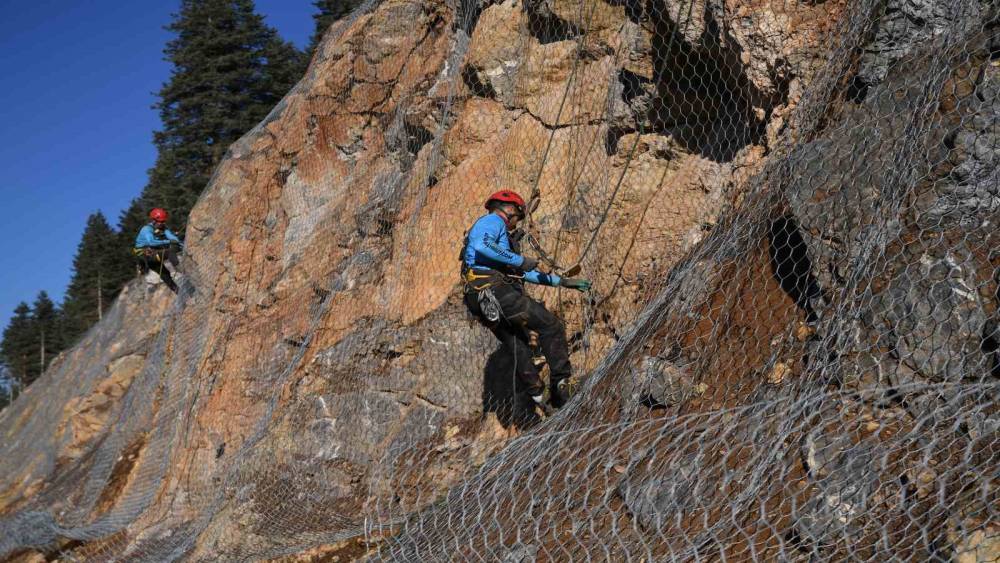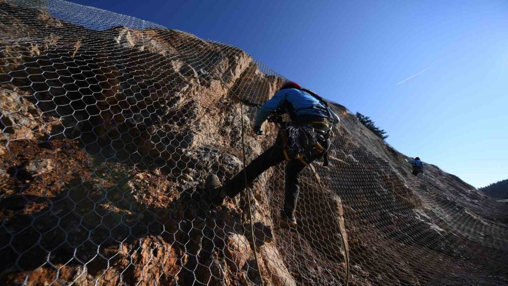 Sık sık heyelanların yaşandığı 2 bin rakımlı dağ çelik ağlarla örülüyor