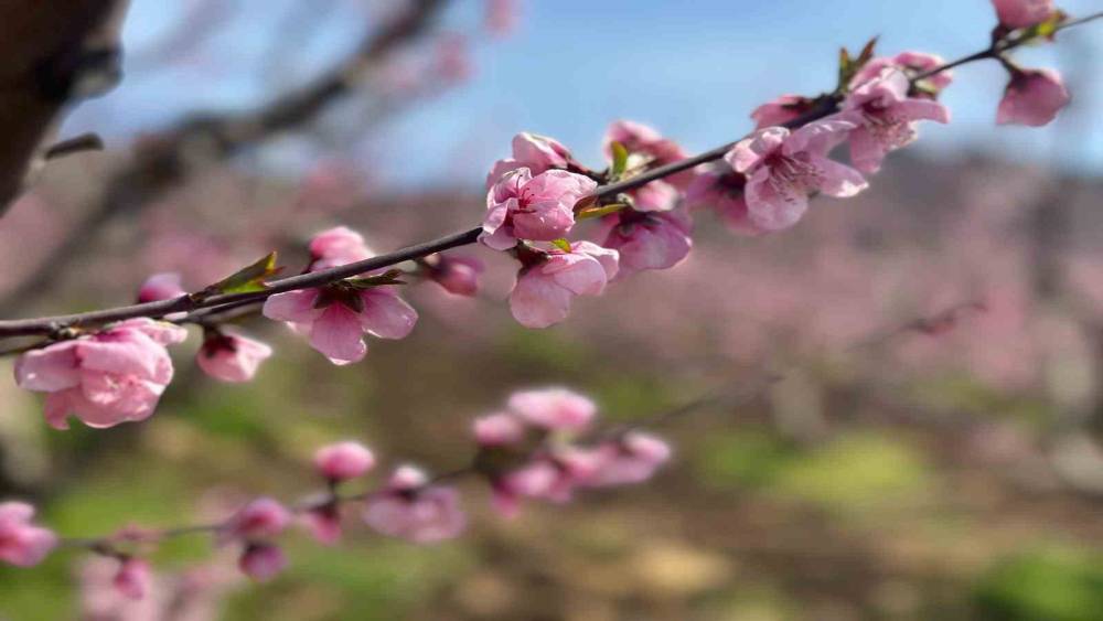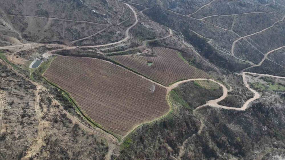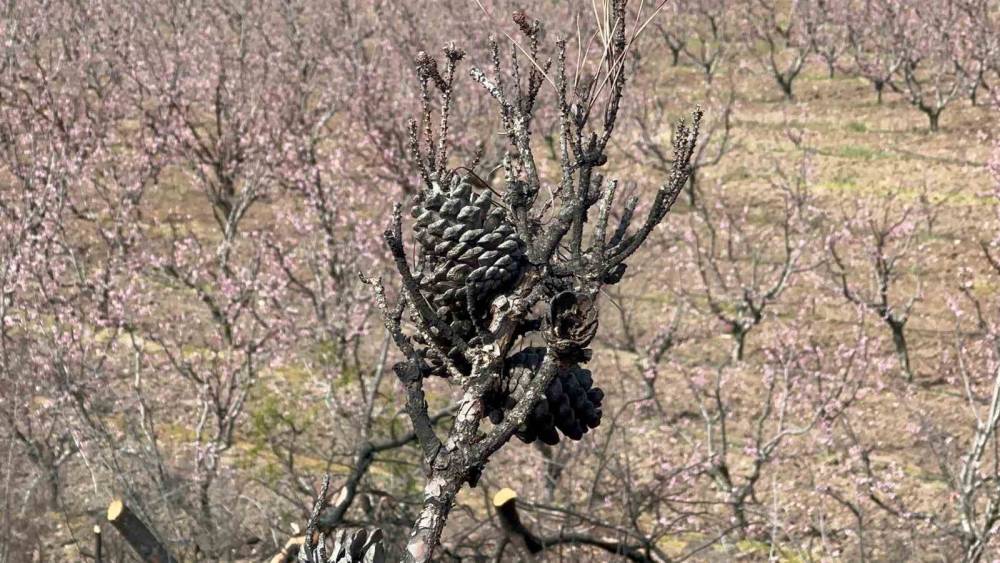 Yükseltilerin arasında, binlerce dekar griye çalan alanın ortasında göz kamaştırıcı bir manzara, bir umut isyanı yükseliyor. Yangının pençesinden sahiplerinin bakımları sayesinden kurtulan, dağların kuytusunda saklı 50 dönümlük şeftali bahçeleri, baharın gelişiyle pembe çiçeklere durdu ve büyüleyici bir görsel şölen sundu.