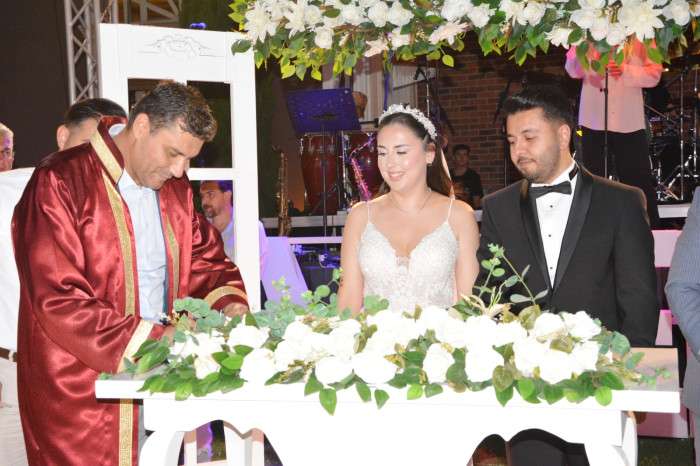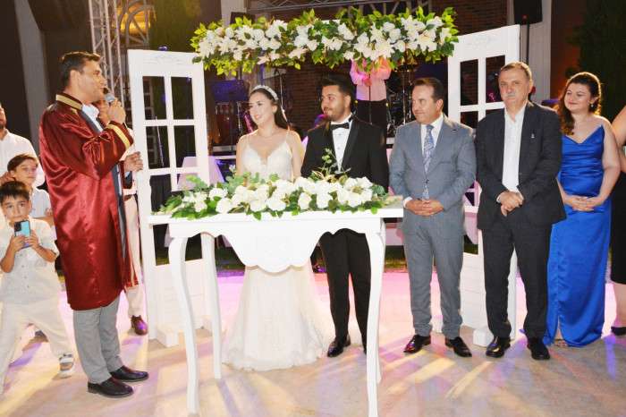 Manisa Büyükşehir Belediye Başkanı Ferdi Zeyrek’in kıydığı nikahta Yağmur-Yılmaz Sait Yücel çiftinin şahitliğini ise Yunusemre Belediye Başkanı Semih Balaban, Manisa Jandarma İl Komutanı Tuğgeneral Zafer Tombul, Genç Sanayici Koran Çertürk, genç siyasetçi Gözde Aytaç, minik oğlu Ertuğrul Aytaç, Gizem Cantimur, Ebru Karalar ile İlayda Ay üstlendi.