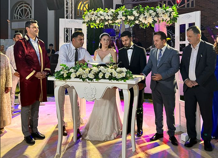 Arena Düğün Salonunda Manisa’daki iş, siyaset, hukukçuları buluşturan düğüne Manisa Büyükşehir Belediye Başkanı Ferdi Zeyrek, Manisa İl Jandarma Komutanı Tuğgeneral Zafer Tombul, Yunusemre Belediye Başkanı Semih Balaban katıldı. Genç avukatlar Yağmur İzci ile Yılmaz Sait Yücel çifti gökyüzünü renklendiren havi fişekleri altında alana giriş yaptı.