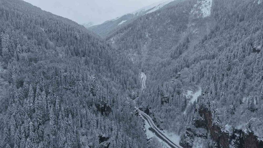 Altındere Vadisi’nde etkili olan kar, ormanlık alanı, kayalık yüzeyleri ve dere çevresini tamamen beyaza kapladı. Vadi boyunca hakim olan doğal sessizlik, kar örtüsüyle daha da derinleşerek bölgeye sakin bir kış atmosferi kazandırdı.
