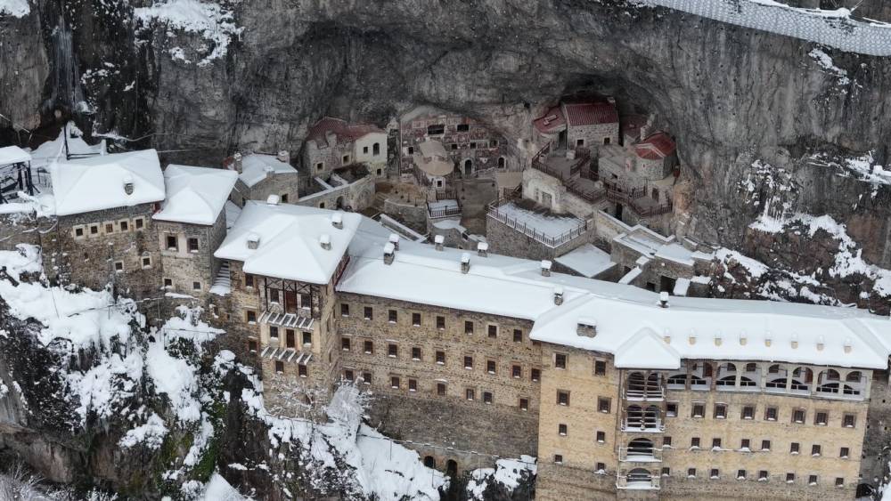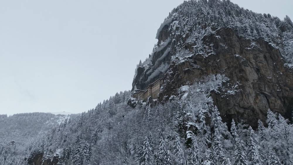 Türkiye’nin önemli inanç ve kültür turizmi merkezlerinden biri olan Sümela Manastırı ve çevresi, kar yağışıyla beyaza büründü. Altındere Vadisi’nin doğal dokusu ve tarihi manastırın atmosferi, kar manzarasıyla birleşince ortaya etkileyici görüntüler çıktı.