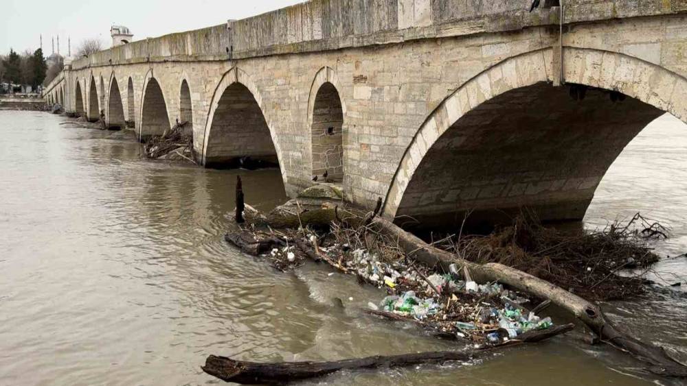 Nehrin üst havzasından sürüklenen ağaç gövdeleri, dev tomruklar ve evsel atıklar, kentin simgelerinden tarihi Meriç Köprüsü’nün kemerlerinde birikti. Suyun yüzeyini kaplayan plastik şişe ve kirlilik tabakası, tarihi köprünün ayaklarında adeta bir set oluşturdu.