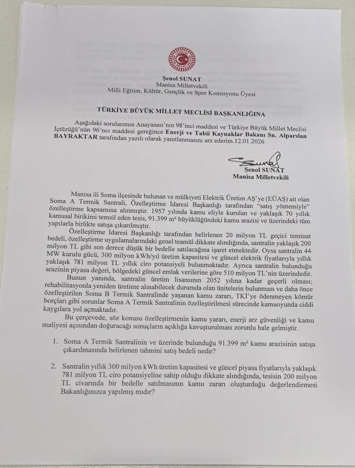İYİ Parti Manisa Milletvekili Şenol Sunat, Manisa’nın Soma ilçesinde bulunan ve mülkiyeti Elektrik Üretim AŞ’ye (EÜAŞ) ait olan Soma A Termik Santrali’nin satış yöntemiyle özelleştirilmesini Türkiye Büyük Millet Meclisi gündemine taşıdı. Sunat, yaklaşık 70 yıllık kamusal birikimi temsil eden santralin düşük bedellerle elden çıkarılmasının kamu yararı açısından ciddi riskler barındırdığına dikkat çekti.