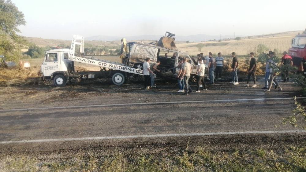 Traktöre yüklenen saman balyaları alev aldı, ticari araç küle döndü
