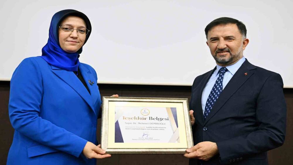 Konferans sonunda Rektör Prof. Dr. Rana Kibar, Dr. Mehmet Demiroğlu’na katkılarından dolayı teşekkür ederek günün anısına teşekkür plaketi takdim etti.