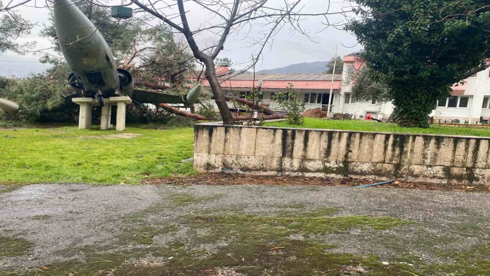 Denizli’de fırtınanın devirdiği çam ağacı, Uçaklı Okulun simgesi uçağın üzerine düştü. Kaidesinden kayan uçak zarar görürken, ortaya çıkan görüntü rüzgarın şiddetini gözler önüne serdi.