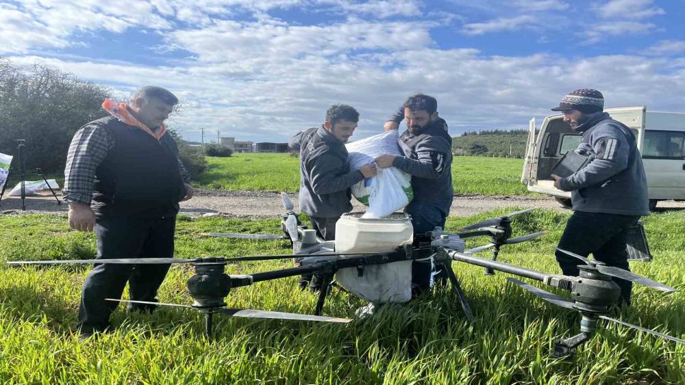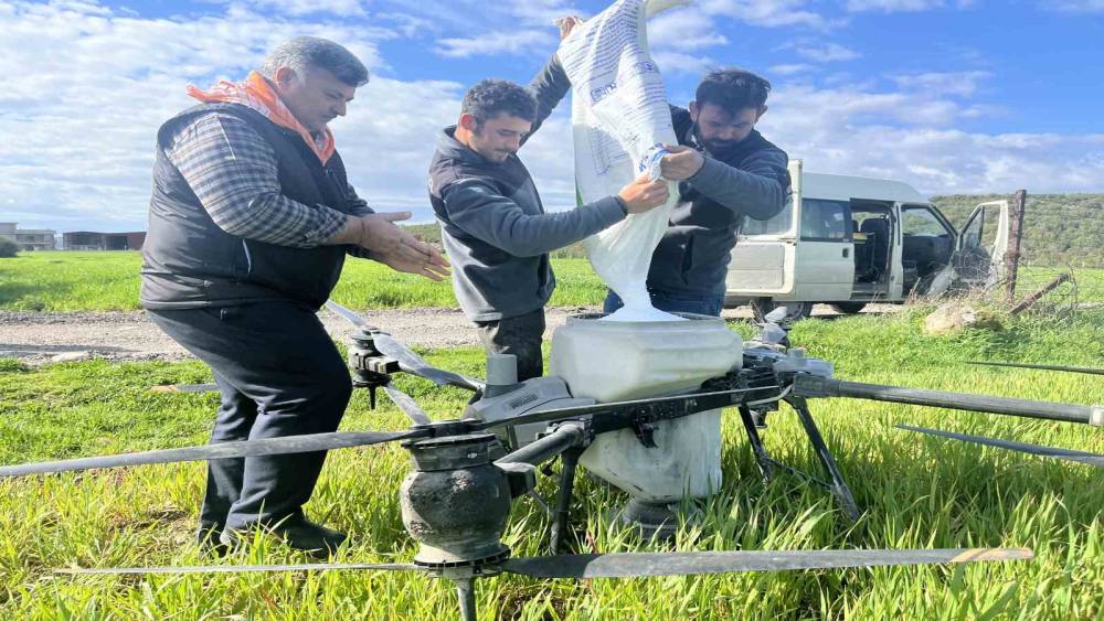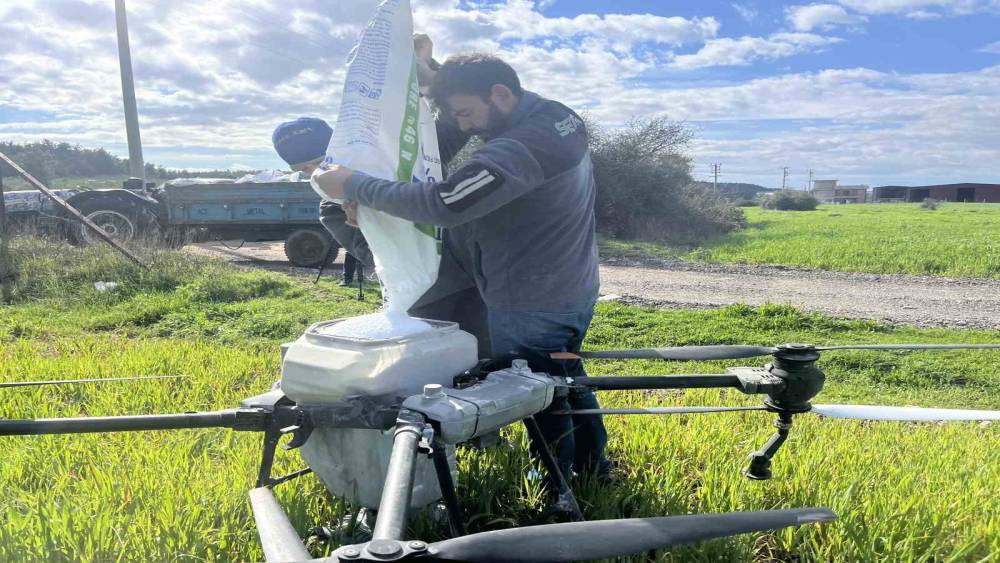 İzmir’de sağanak yağışların ardından tarlalar balçığa döndü. Traktörleriyle araziye giremeyen çiftçiler gübreleme işlemlerini zirai insansız hava araçlarıyla yapmaya başladı.