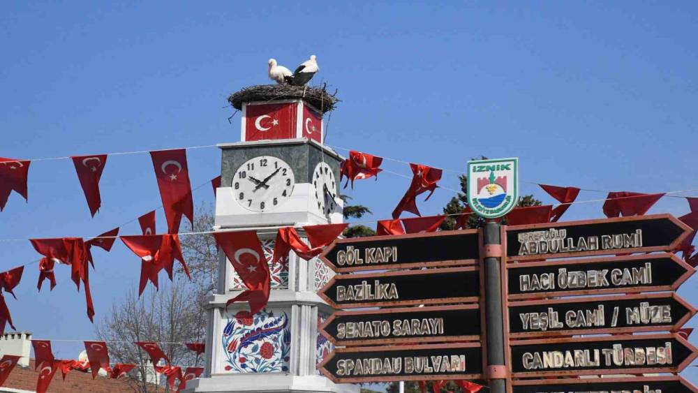 İki leylekten biri bu yıl önce İznik merkezindeki saat kulesinde bulunan yuvasına geldi. Aradan geçen dört günün ardından eşi de yuvaya gelerek ikinci yıllarında yeniden İznik’te buluştular.