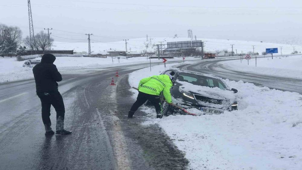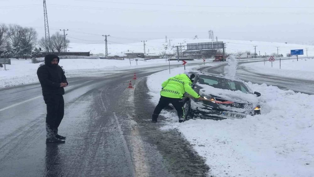 Bitlis’te yoğun kar yağışı sebebiyle karla kaplanan ve buzlanmanın etkili olduğu güzergâhlarda ilerlemekte zorlanan araçlar kara saplandı. İl Emniyet Müdürlüğü’ne bağlı Trafik Tescil Şube Müdürlüğü ekipleri, kara saplanan otomobillerin önündeki karları, kar kürekleri ile temizledikten sonra çıkarttı. Araç sürücüleri, kendilerine yardımcı olan polis ekiplerine teşekkür ederken yetkililer, sürücülerin kış şartlarına uygun lastik kullanmaları, hızlarını düşürmeleri ve trafik kurallarına uymaları konusunda uyarılarda bulundu.